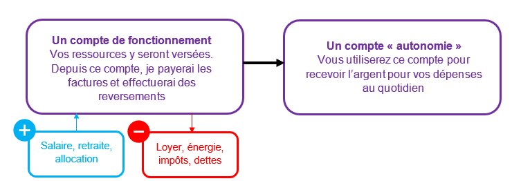 Dans le cadre d’une mesure de curatelle renforcée ou de tutelle, le protecteur assure un rôle de gestion. Il perçoit vos ressources (CAF, retraite, salaire) sur un compte de fonctionnement ouvert à votre nom. Il assure le règlement de vos dépenses et vos dettes auprès des tiers (électricité, loyer, …).